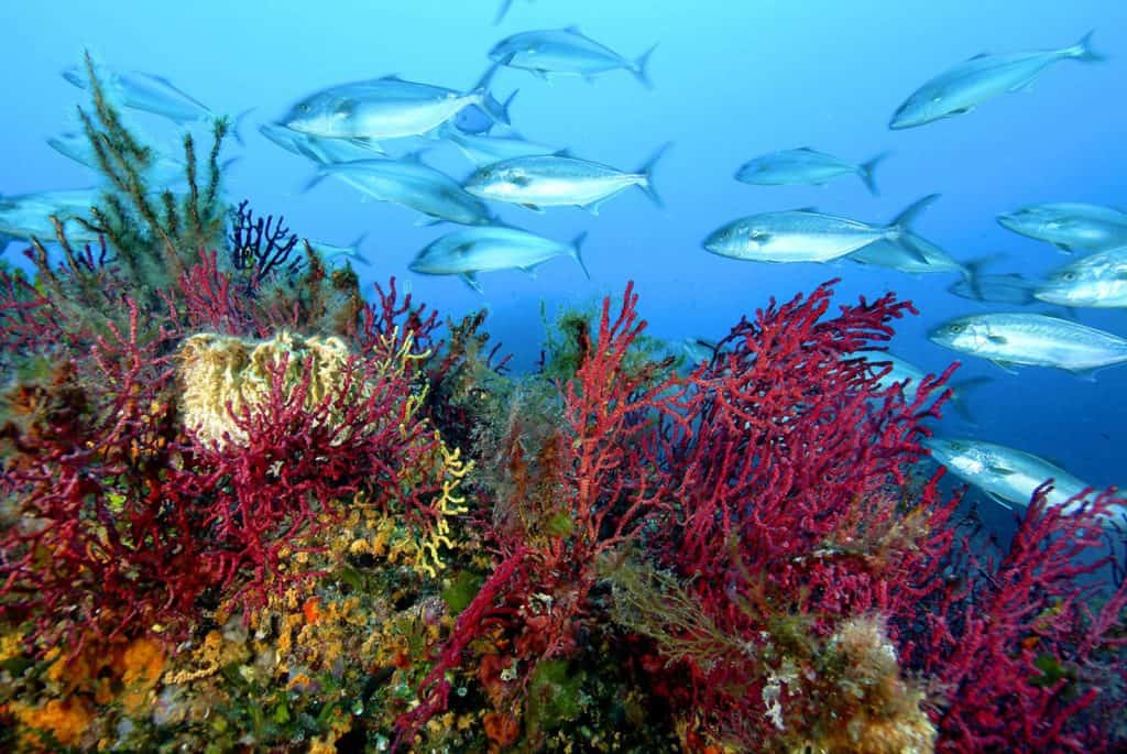 The sea of the sheltered cove is calm and rich in biodiversity inside and outside of the water.